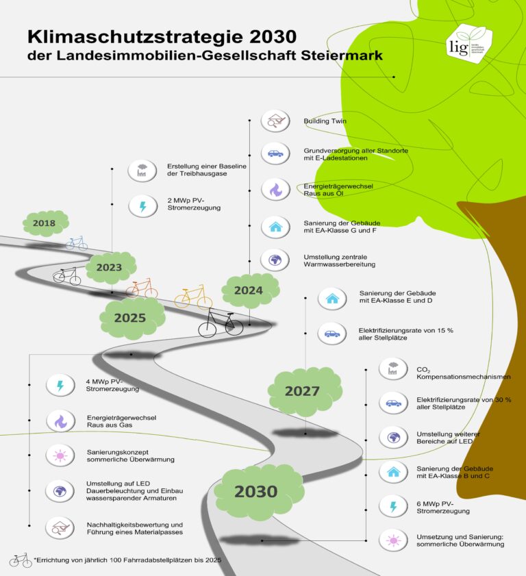 Die Umsetzung der Klimaschutzstrategie der Immobilienverwaltung Land Steiermark wird in die Kategorien kurz-, mittel- und langfristig eingeteilt.